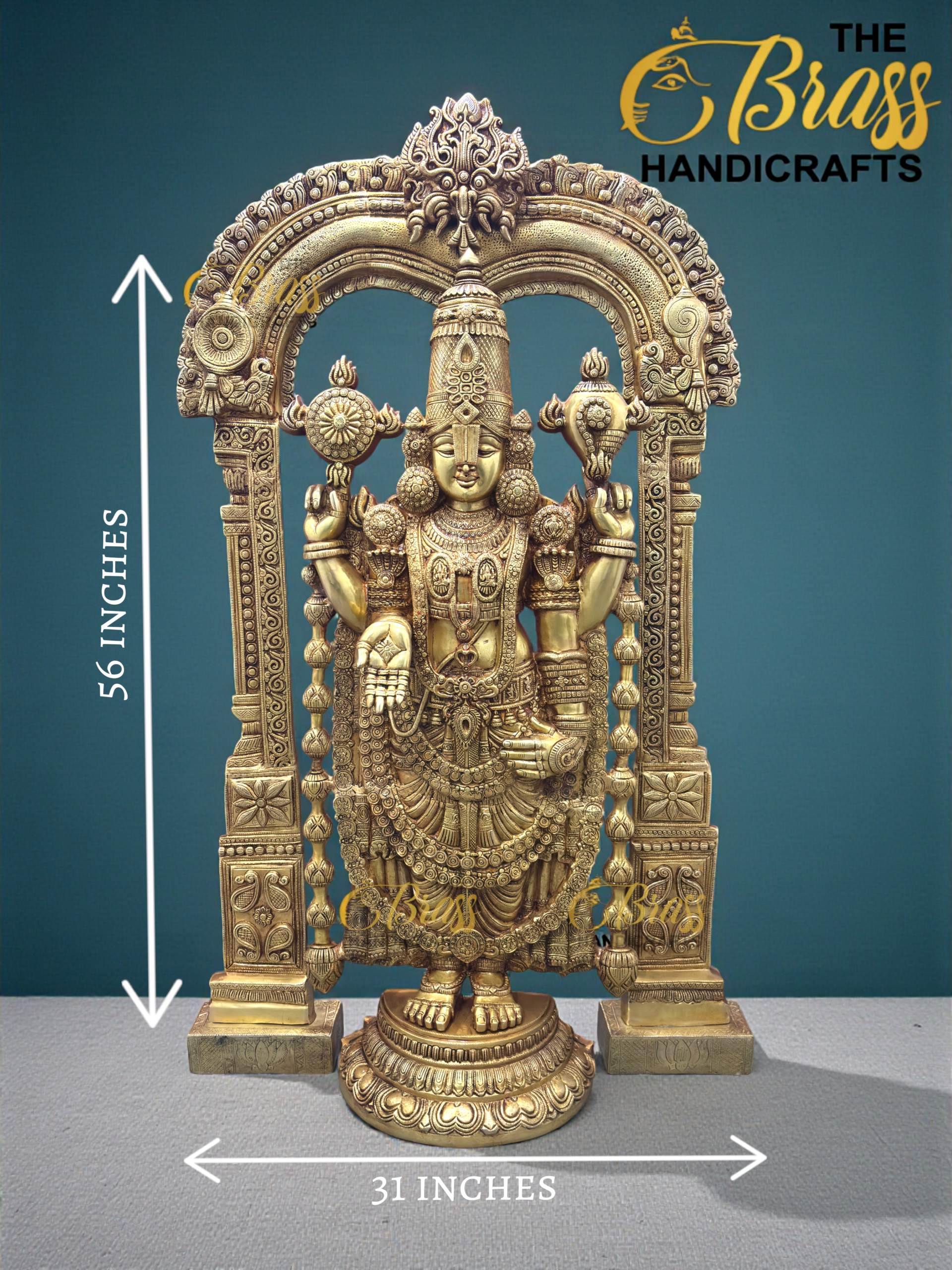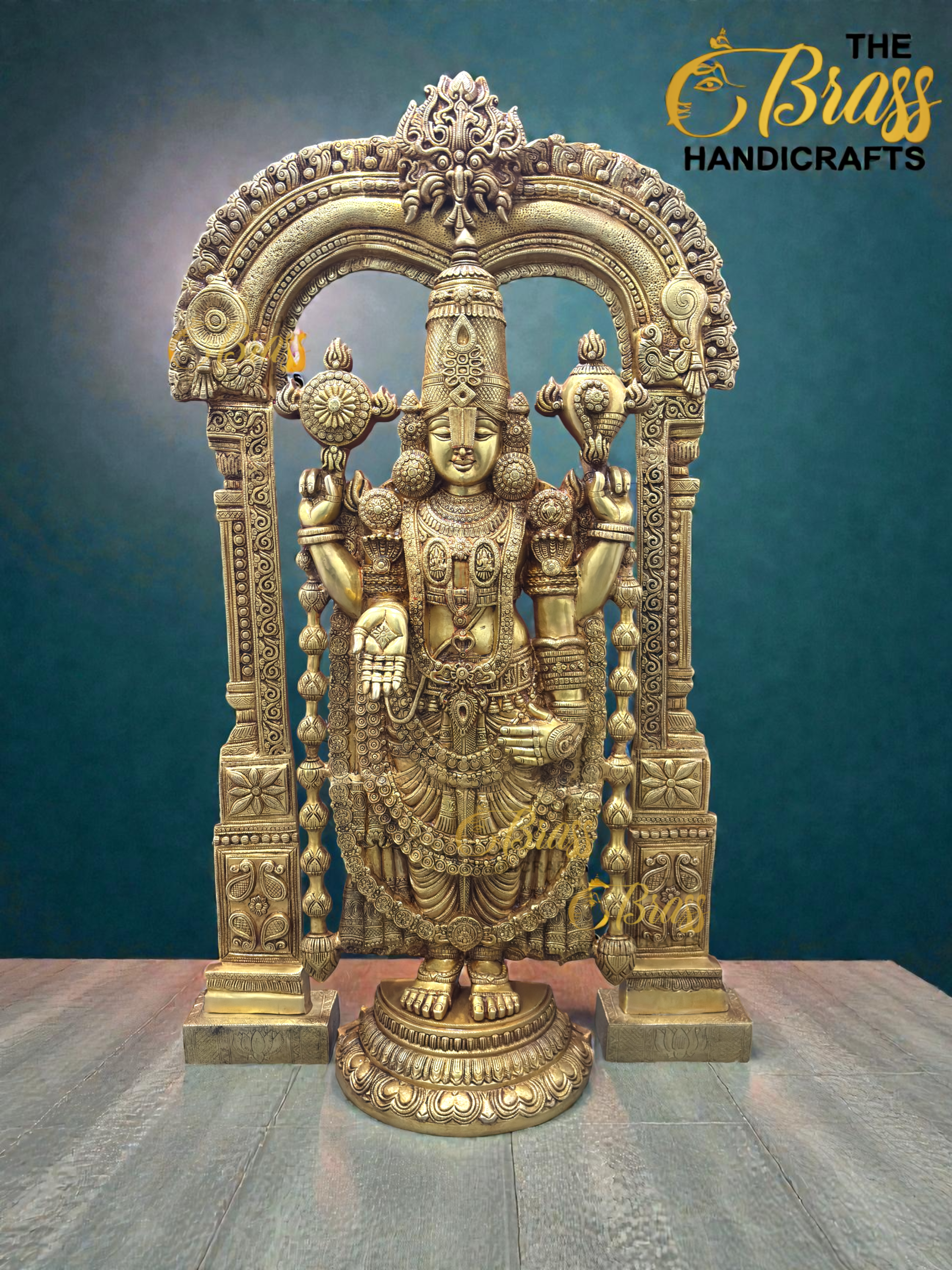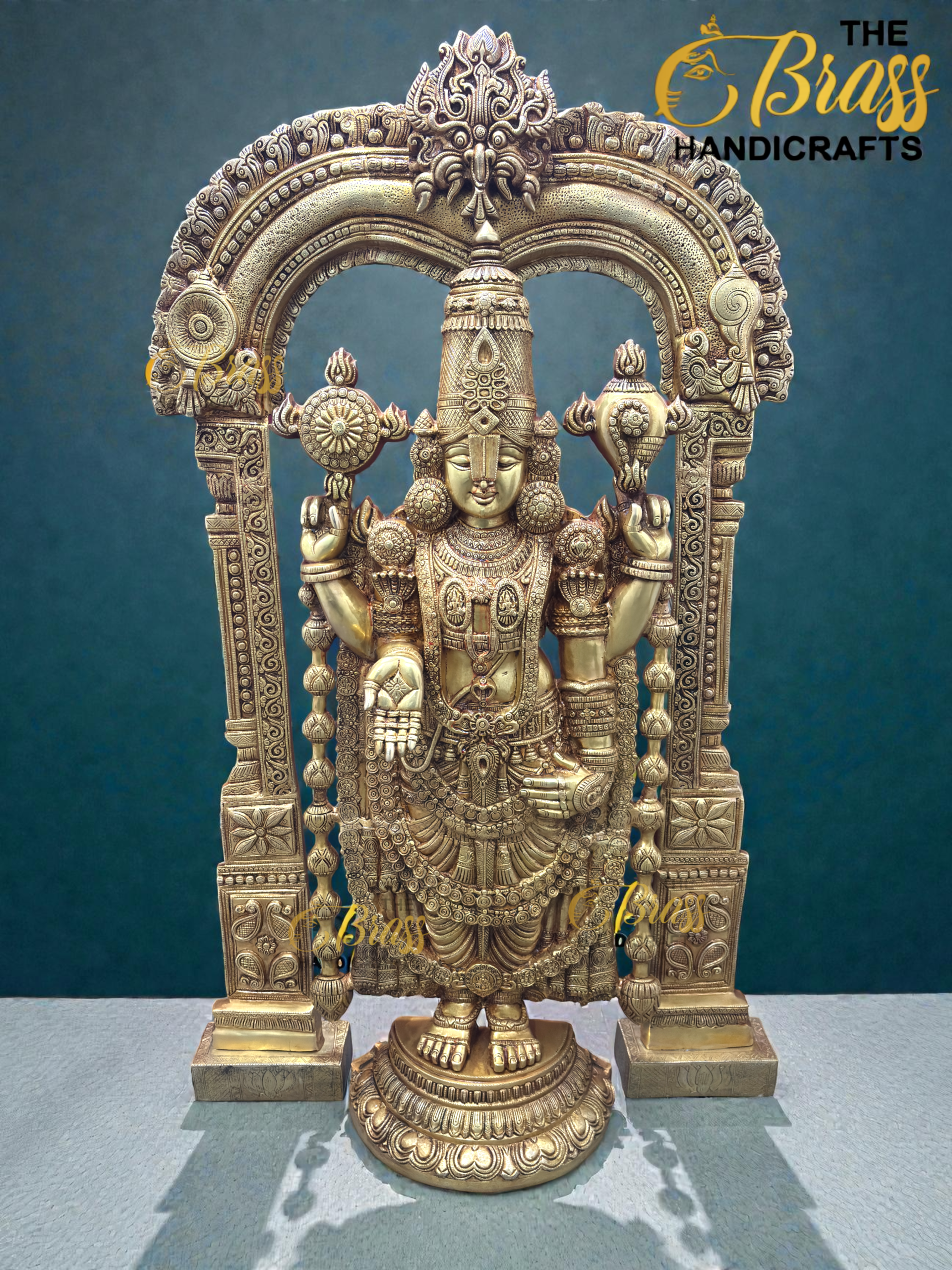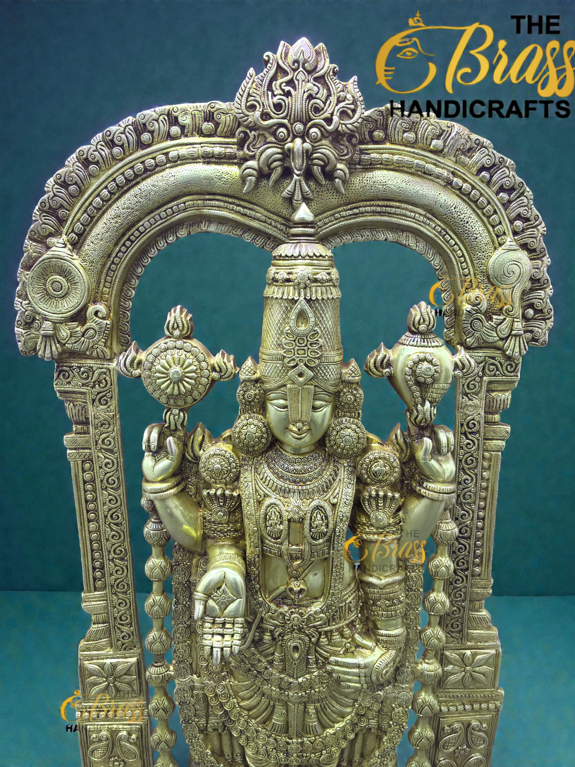 Crafted by master artisans using traditional South Indian temple techniques, this floor-standing Tirupati Balaji murti is a rare collector’s piece. Every detail — from the intricately carved crown and jewelry to the elaborately designed frame and pedestal — reflects precision, devotion, and artistic excellence.