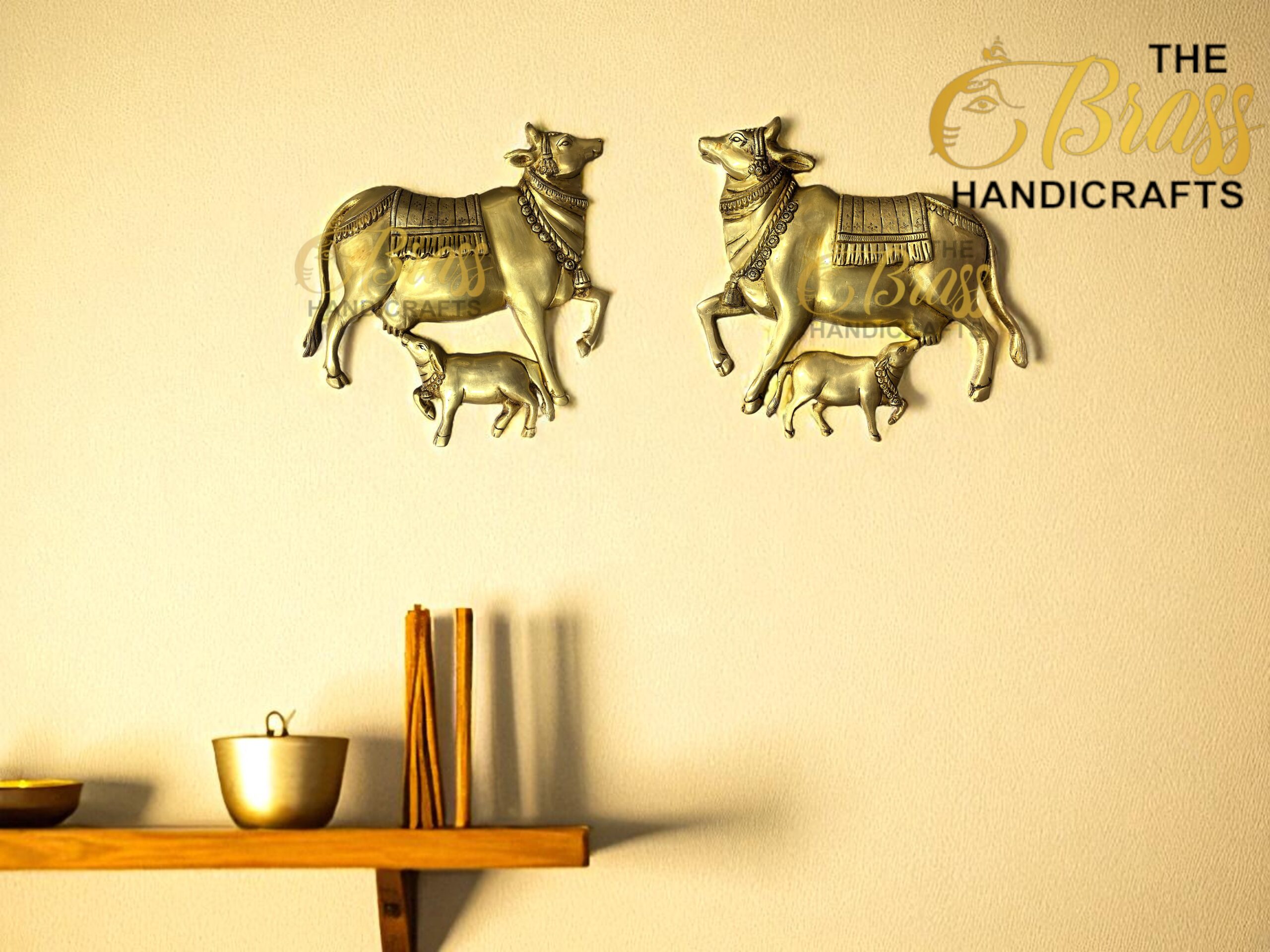 Bring home the symbol of divine prosperity and motherhood with our Brass Cow & Calf Wall Hanging Pair — a masterpiece of traditional Indian craftsmanship. This set includes two brass wall hangings, one facing left and one right, perfectly designed for symmetrical wall placement.