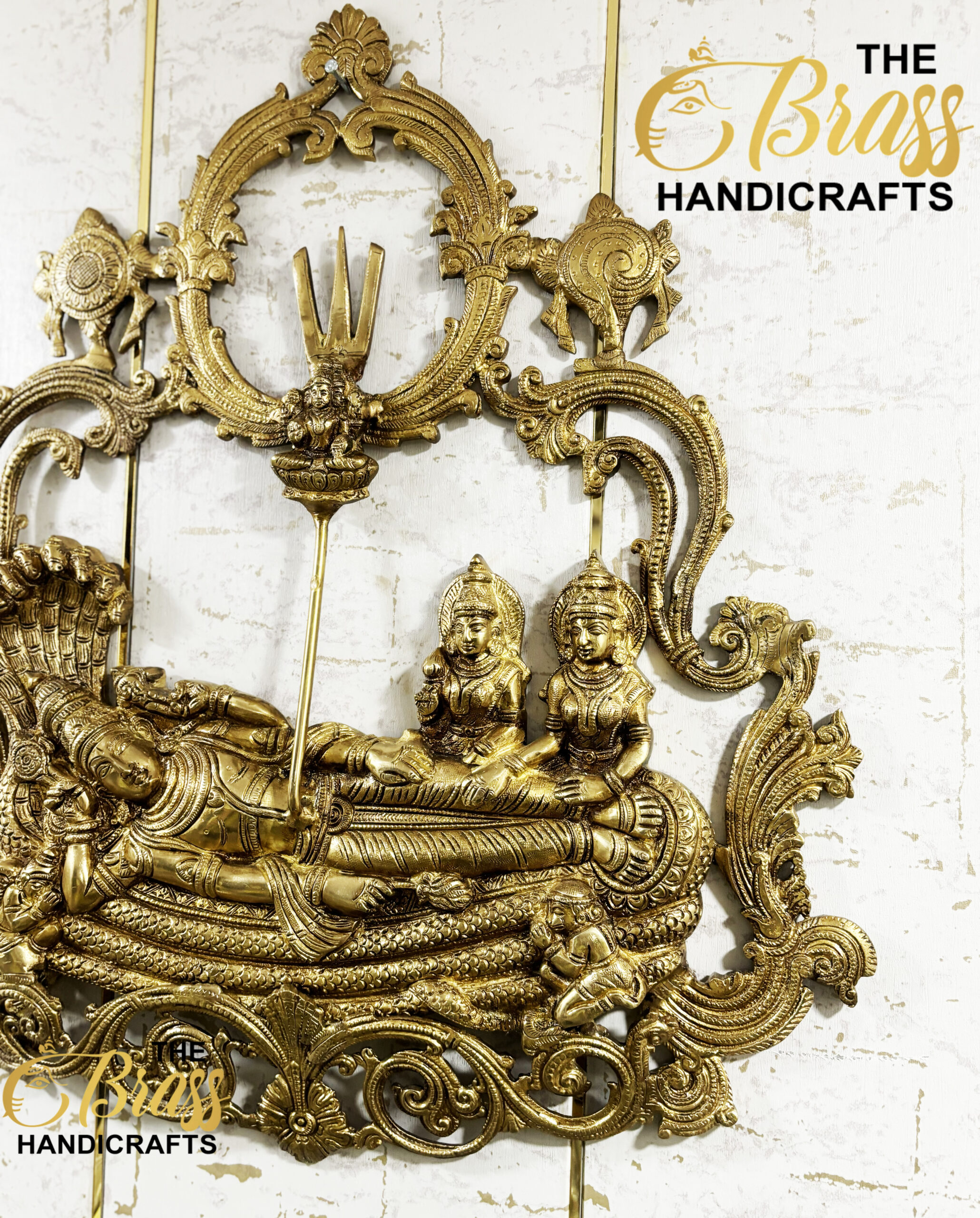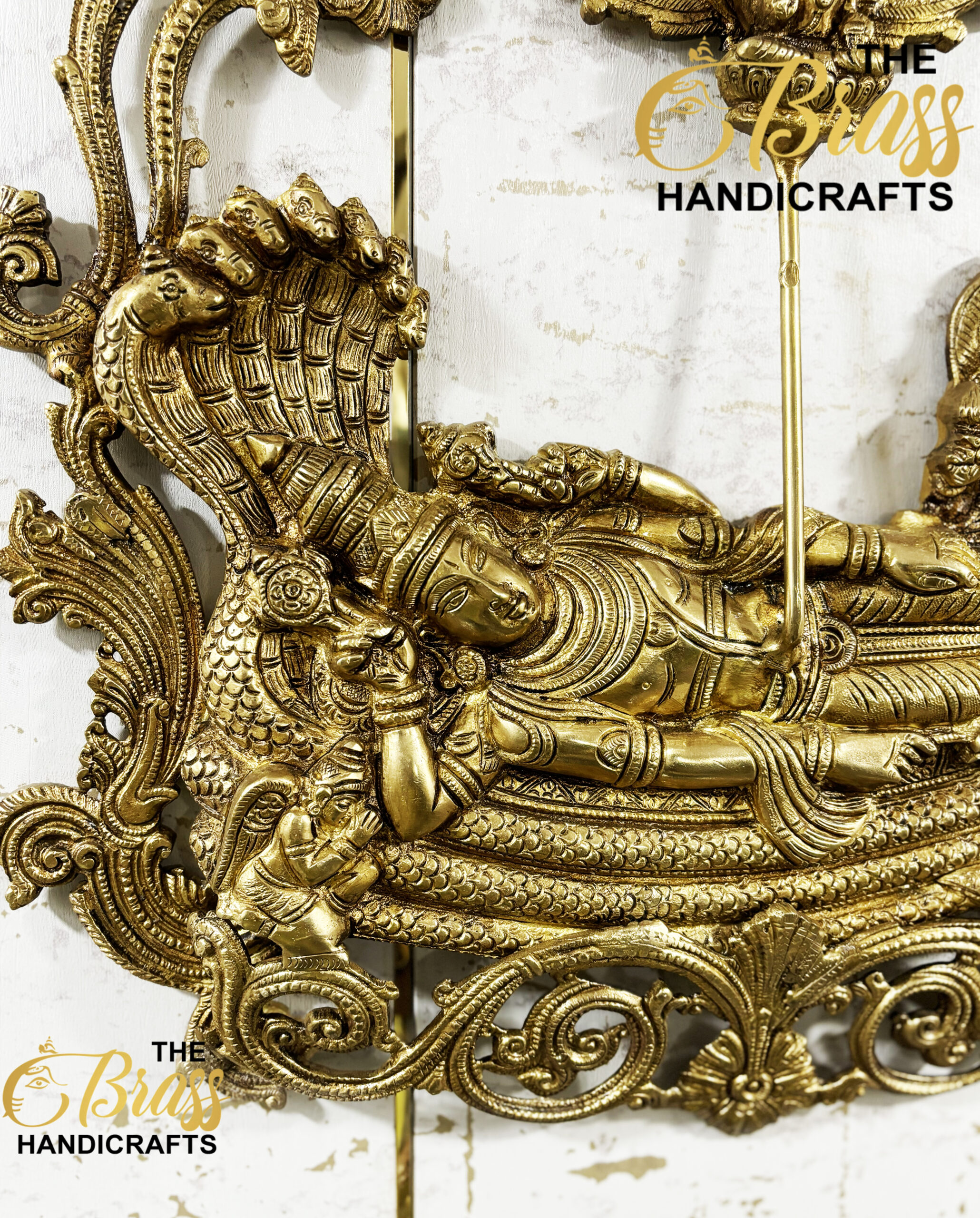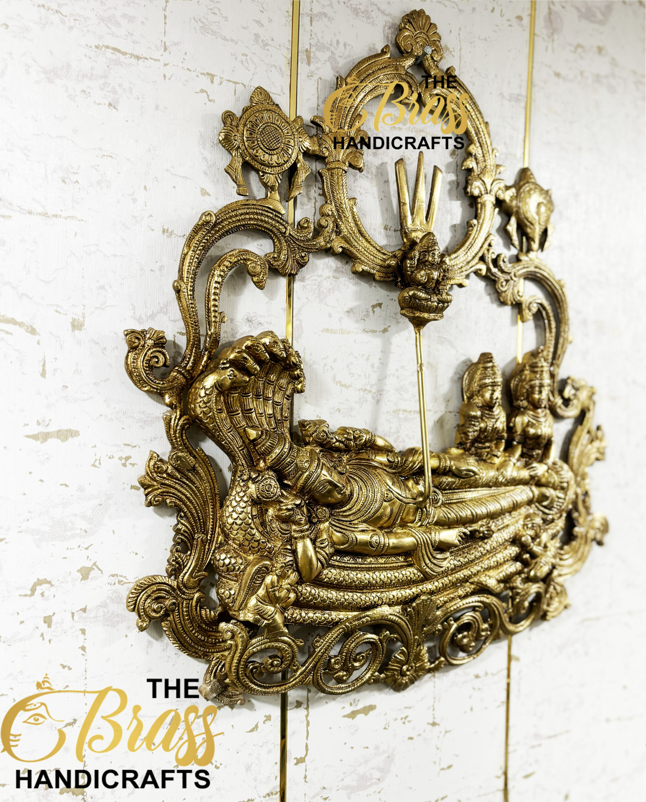 Enrich your home with the divine splendor of our Brass Vishnu Lakshmi (Padmanabha Swamy) Wall Hanging, standing at an impressive 23 inches. This exquisite piece features Lord Vishnu and Goddess Lakshmi, revered deities symbolizing protection, prosperity, and spiritual well-being. Crafted from high-quality brass, this wall hanging is a perfect blend of artistry and spirituality.