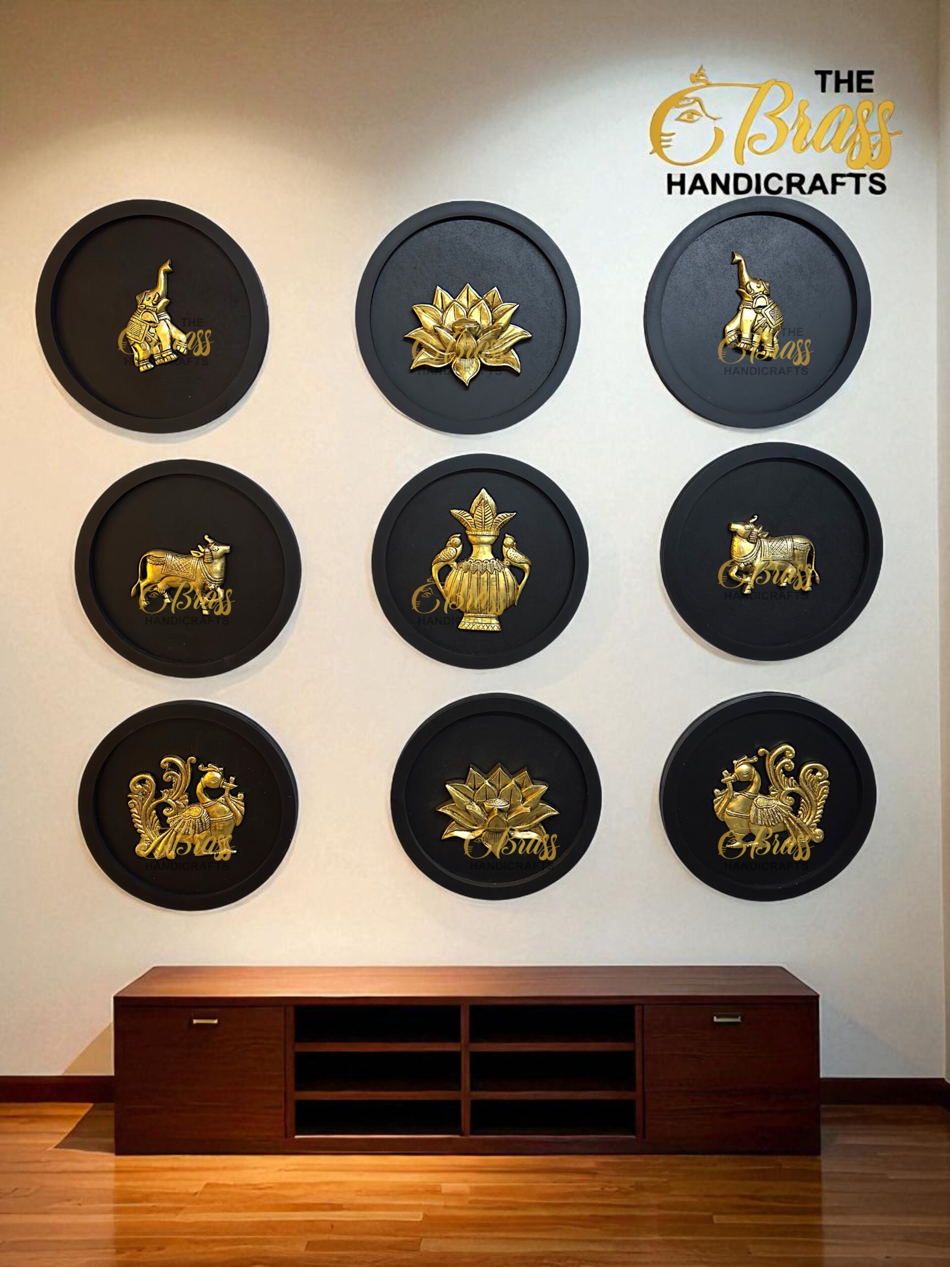 Enhance your interiors with the perfect blend of tradition and modernity through our Set of 9 Brass Wall Decor Motifs framed in elegant round wooden panels. Each piece is a stunning combination of pure brass craftsmanship and premium MDF framing, designed to bring timeless beauty and cultural richness to your space.