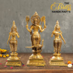 Embrace the divine presence of our Divine Brass Lord Murugan with Devasena and Valli Statues. Standing majestically at 25 inches, this stunning set captures the essence of Lord Murugan, the beloved deity known for his valor, wisdom, and protection, alongside his consorts Devasena and Valli. This trio of intricately crafted brass statues brings an aura of spirituality, beauty, and tradition to your home, making it a perfect addition for any sacred space or living area.