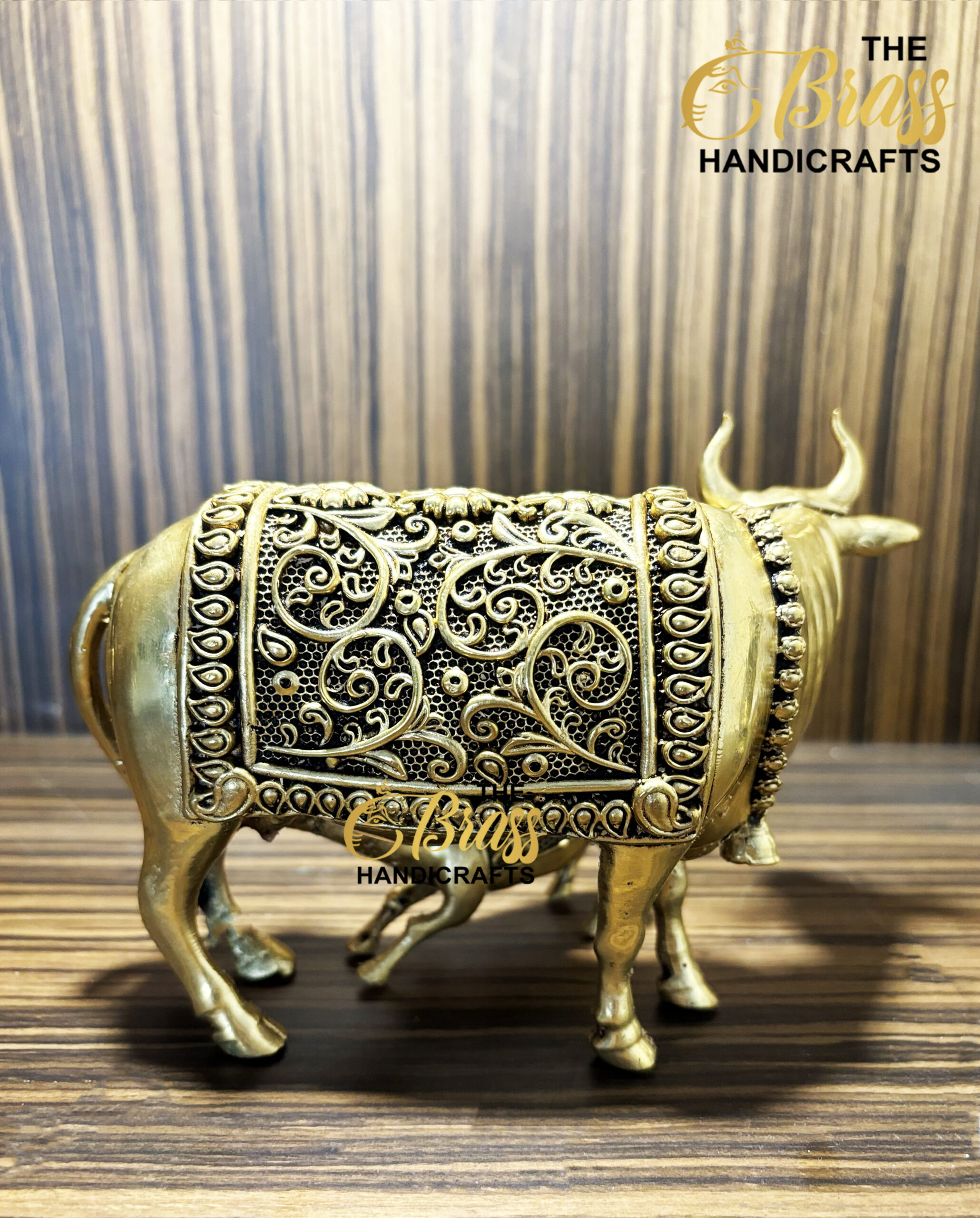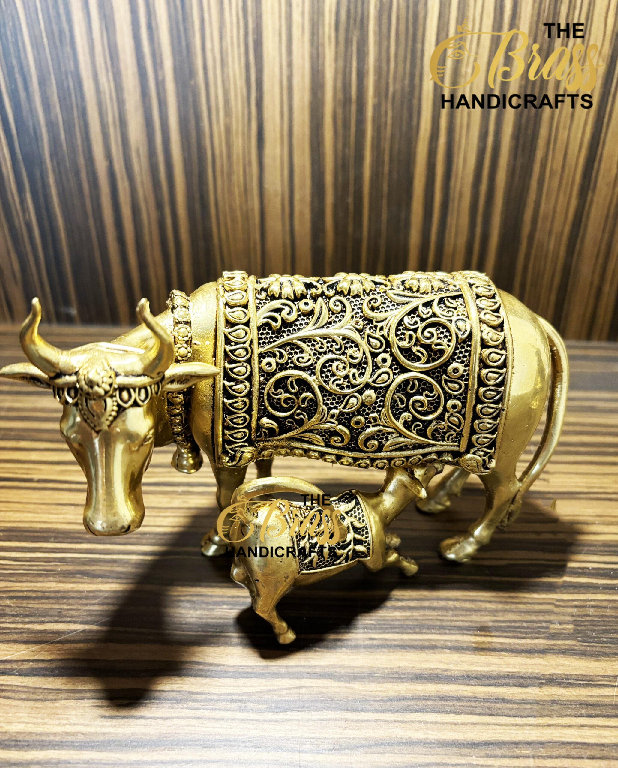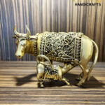 Elevate your home decor with the Exquisite Brass Cow and Calf statue, a masterful representation of maternal love and nurturing grace. This stunning piece is meticulously handcrafted from high-quality brass, standing at 3 inches tall, 5.5 inches long, and 2.5 inches wide, with a substantial weight of 750 grams. The artisans have paid great attention to every detail, capturing the tender expressions and intricate patterns that adorn the cow and her calf.