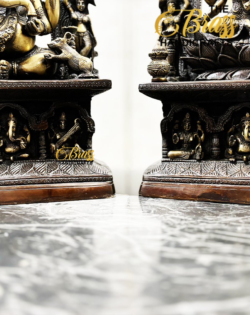 Elevate the aesthetic and spiritual ambiance of your home or office with our Exquisite Brass Ganesh Lakshmi Statues. These stunning statues stand at an impressive height of 20 inches (50.8 cm), with each statue measuring 12 inches (30.48 cm) in length and 5 inches (12.7 cm) in width. Together, they weigh a substantial 30 kg, making them a durable and striking addition to any decor.