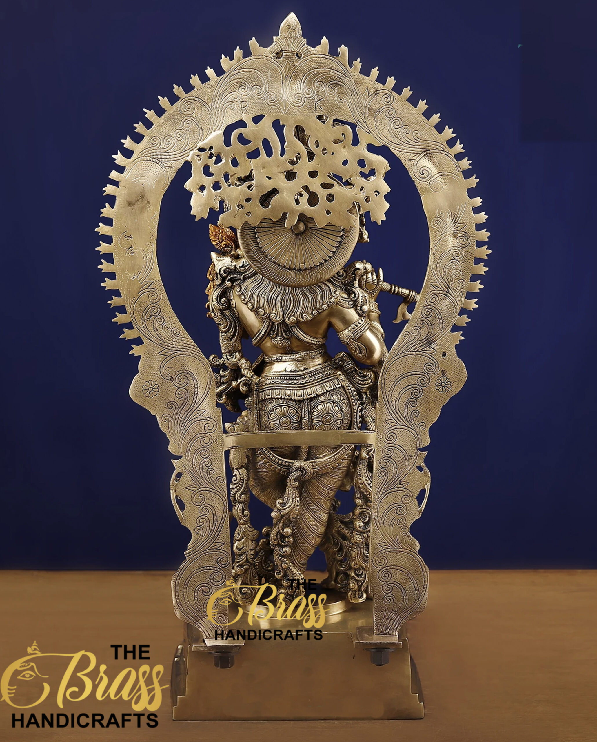 Introducing a magnificent addition to your décor: the Lord Krishna Statue in Brass. Standing at an impressive 81CM (approximately 32 inches) in height and 12 inches in width, this large Krishna brass idol exudes elegance and spiritual significance. Weighing 34 kgs, this handcrafted sculpture is a testament to the skilled artisans from a small business in India who have meticulously crafted every detail.