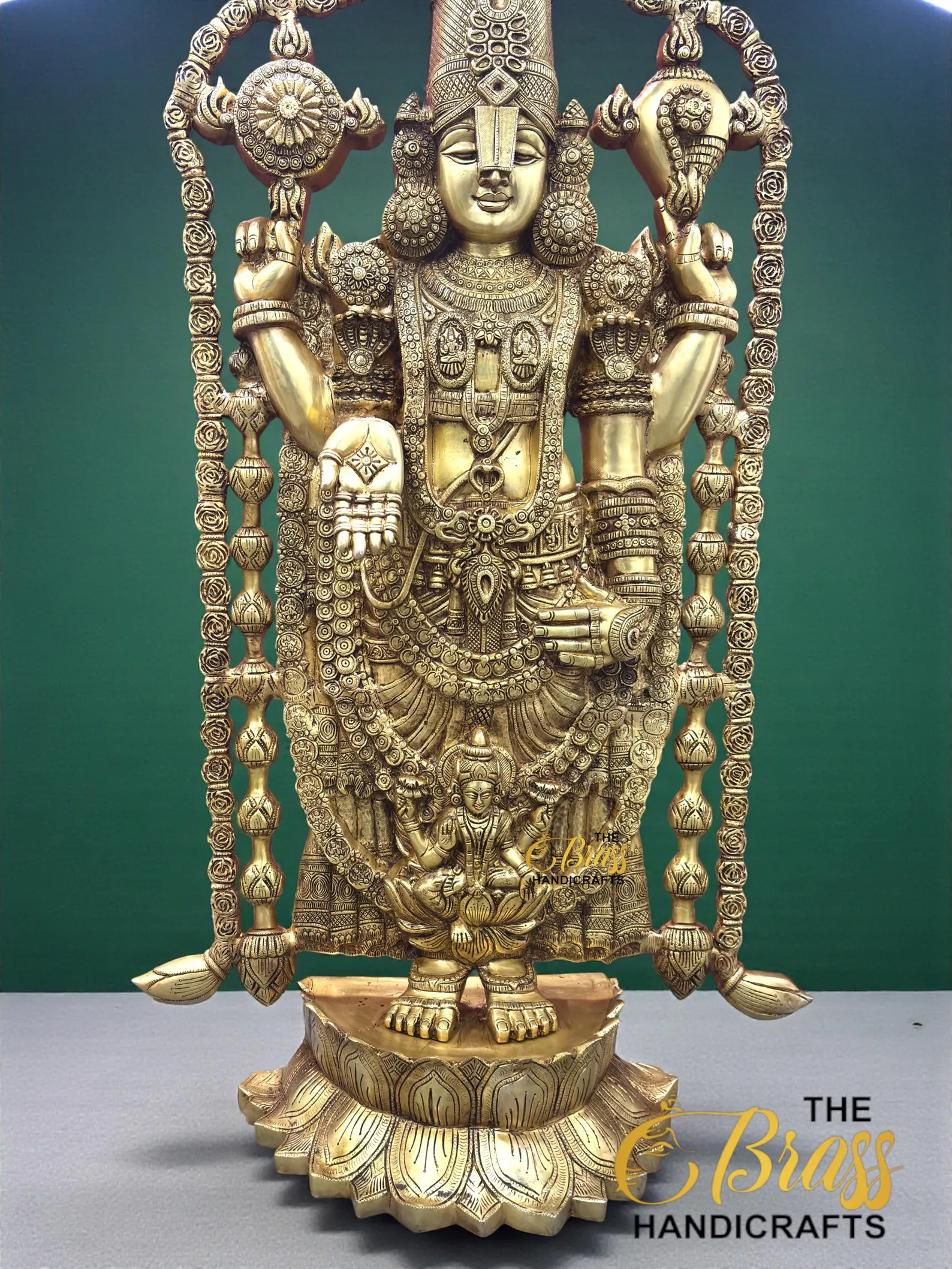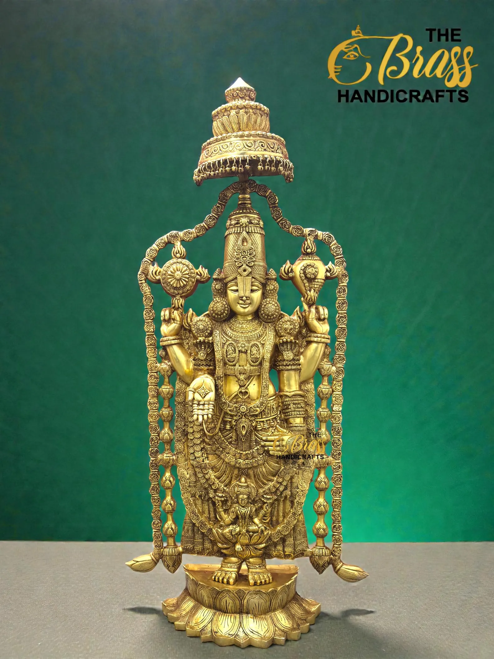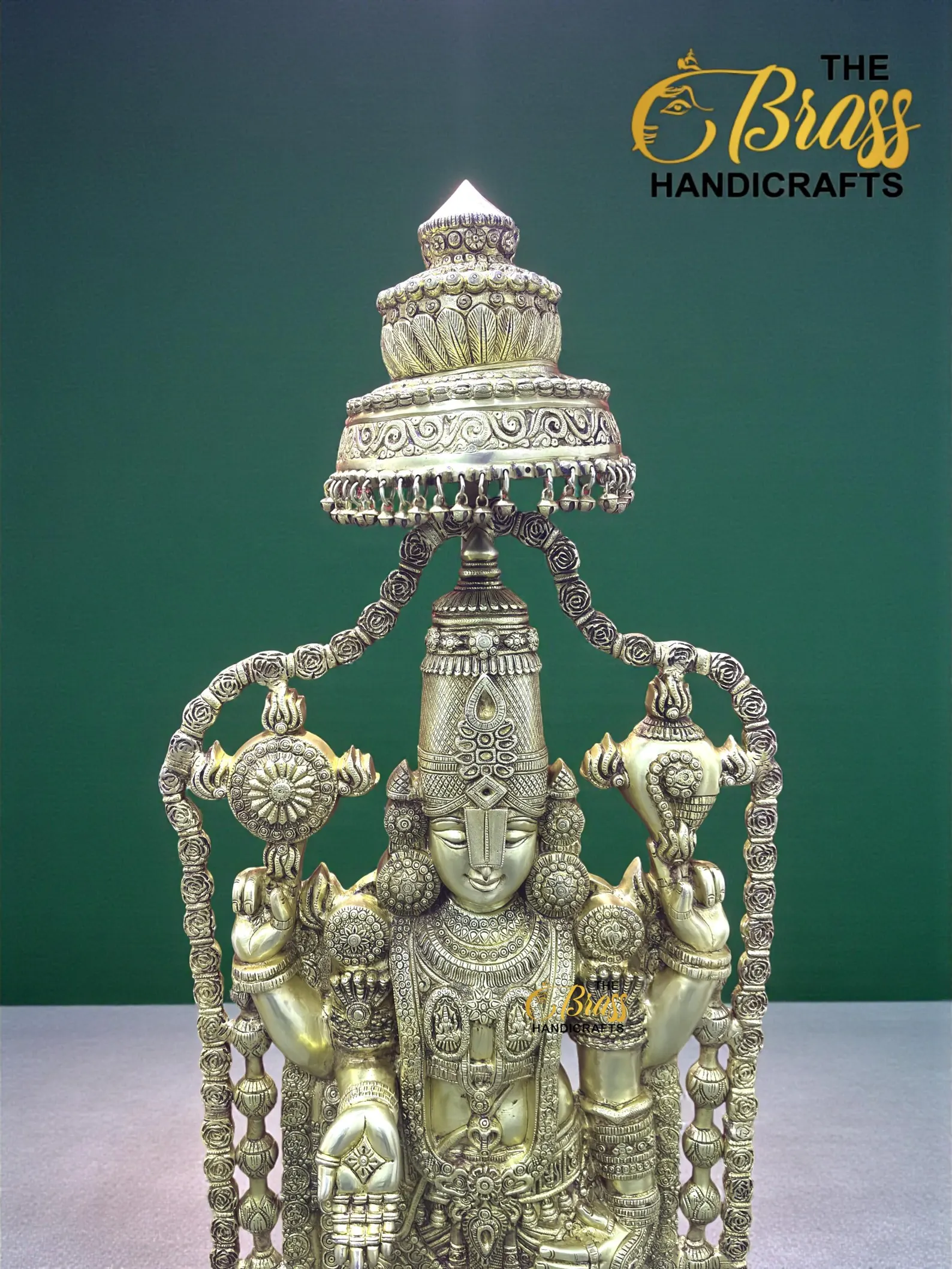 Experience divine magnificence with this 58-inch Pure Brass Tirupati Balaji Idol, a grand representation of Lord Venkateshwara crafted with exceptional artistry and devotion. Standing nearly five feet tall and weighing approximately 60 kg, this monumental idol radiates temple-like presence and spiritual authority. Designed with an intricately detailed gopuram-style arch and beautifully sculpted garland, every element reflects traditional South Indian craftsmanship.