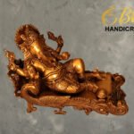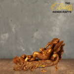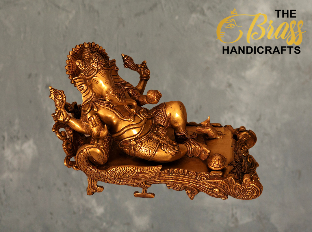 Add an aura of divinity and elegance to your space with the Reclined Ganesha on Mayur Sinhasana. This exquisite piece is meticulously handcrafted from high-quality brass, ensuring durability and a timeless appeal. The statue depicts Lord Ganesha in a serene, reclined posture on a beautifully detailed Mayur (peacock) throne, symbolizing wisdom, prosperity, and good fortune.